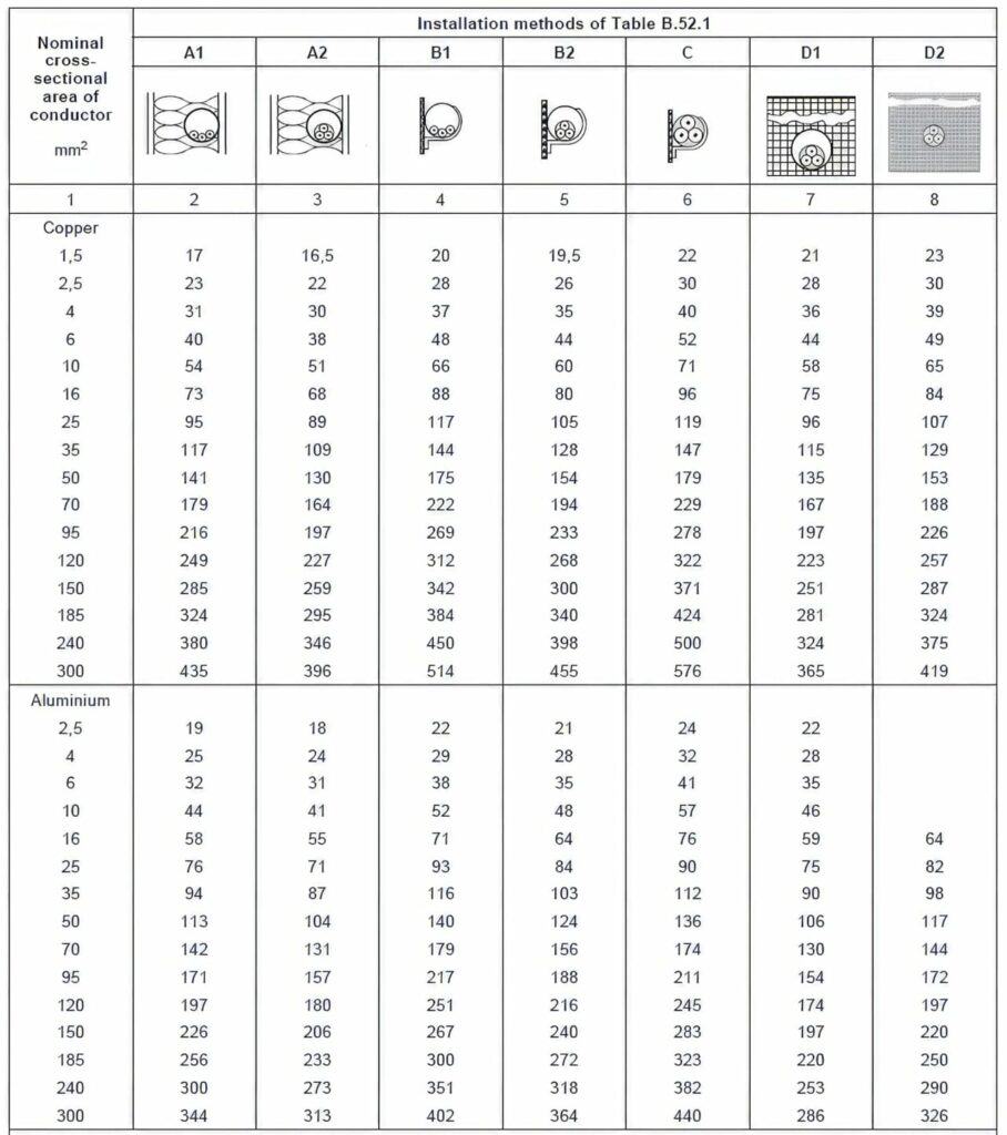 Table B.52.2 – Current-carrying capacities in amperes for methods of installation in Table B.52.1 – PVC insulation/two loaded conductors, copper or aluminium – Conductor temperature: 70 °C, ambient temperature: 30 °C in air, 20 °C in ground [3]
