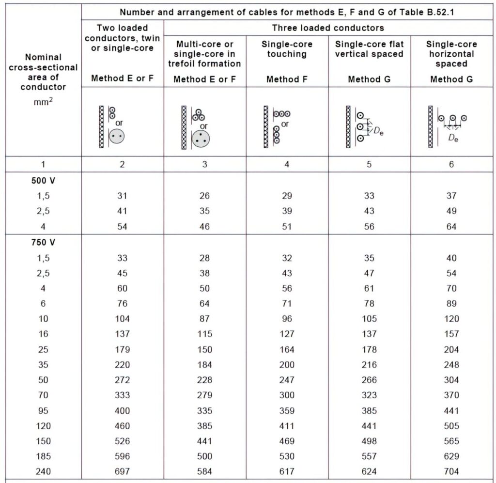Table B.52.3 – Current-carrying capacities in amperes for methods of installation in Table B.52.1 – XLPE or EPR insulation, two loaded conductors/copper or aluminium – Conductor temperature: 90 °C, ambient temperature: 30 °C in air, 20 °C in ground [3]