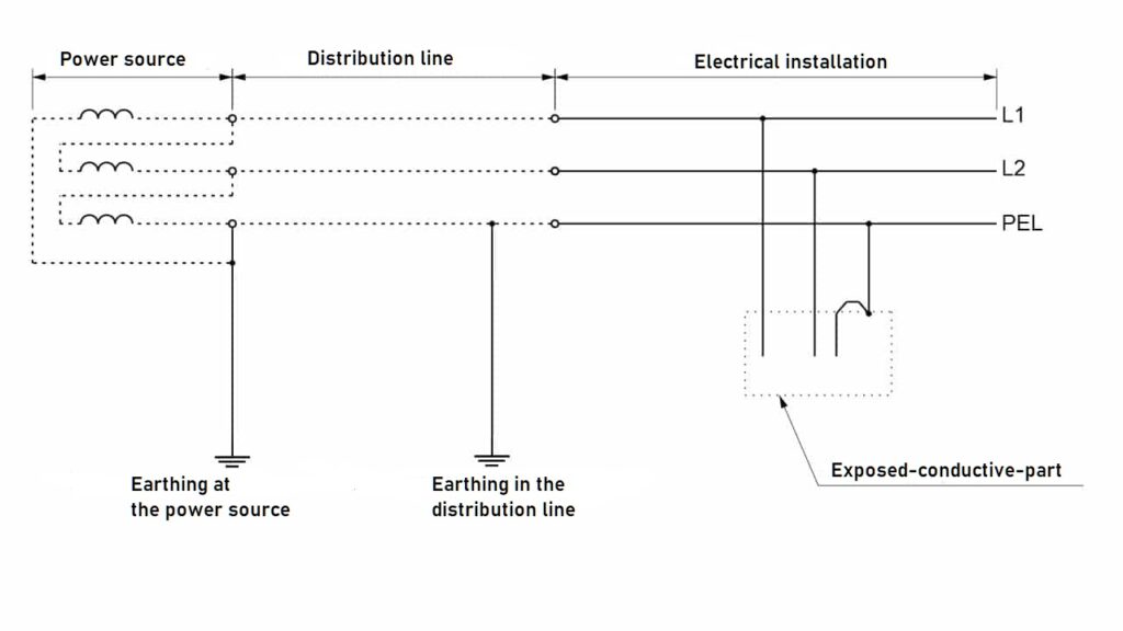 - N – the exposed-conductive-parts have direct connection with the earthed live part of the power source executed by PEN, PEM, PEL conductors or protective earthing conductors (PE).